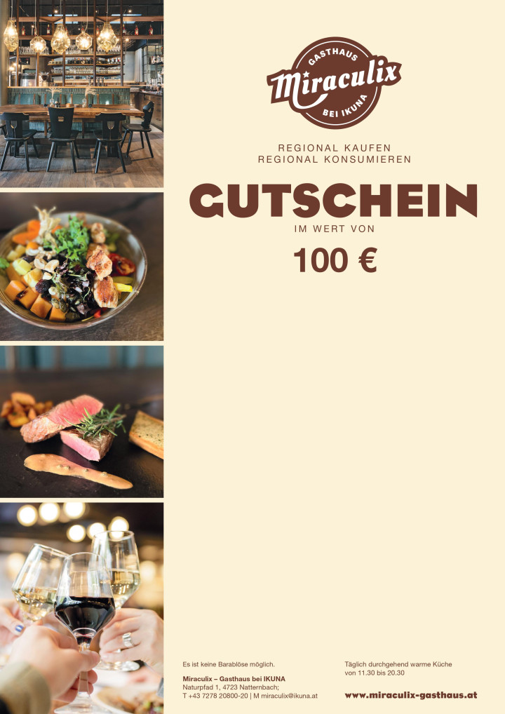Ob zum Geburtstag oder als kleines Dankeschön: Für kulinarische Genießer, die gerne Zeit mit der ganzen Familie verschenken wollen, haben wir die Miraculix € 100,- Wertgutscheine.