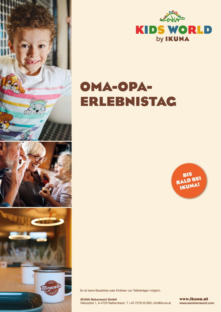 Genieße einen Oma-Opa-Erlebnistag in der KIDS WORLD by IKUNA und stärke dich zwischendrin im angrenzenden Miraculix - Gasthaus bei IKUNA mit Köstlichkeiten.