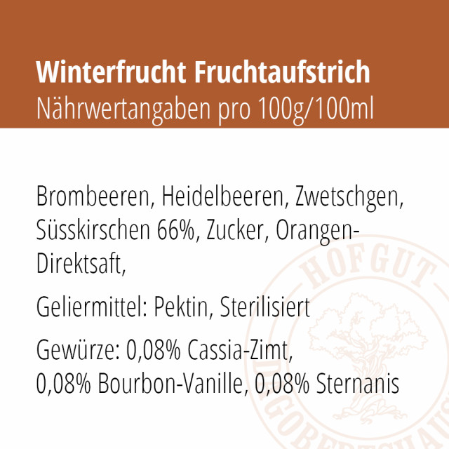 Passend zur kalten Jahreszeit freuen wir uns Ihnen diese erlesene Komposition aus Brombeere, Heidelbeere, Zwetschge & Süßkirsche, veredelt mit weihnachtlichen Gewürzen, präsentieren zu können. Der besonders hohe Fruchtanteil von 66% ist die Basis für diesen exquisiten Genuss.